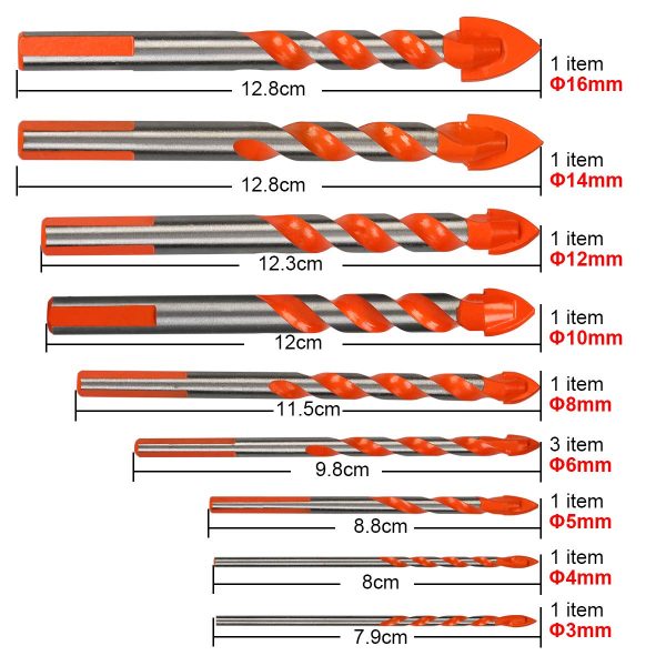 Größe: 3mm, 4mm, 5mm, 3*6mm, 8mm, 10mm, 12mm, 14mm, 16mm. Durchmesser: 6.35mm (1/4 „) 11 Stücke Fliesenbohrer in 7 Größe entsprechen Ihre Nachfrage von verschiedenen Bohrungen bei der Verwendung. Es gibt 3x 6mm am üblichsten Keramikbohrer im Liefer für Ihr zu verwenden.