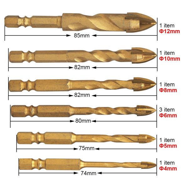 Größe: 4mm, 5mm, 3*6mm, 8mm, 10mm, 12mm. Durchmesser: 6.35mm (1/4 „) 8 Stücke Fliesenbohrer in 7 Größe entsprechen Ihre Nachfrage von verschiedenen Bohrungen bei der Verwendung. Es gibt 3x 6mm am üblichsten Keramikbohrer im Liefer für Ihr zu verwenden.