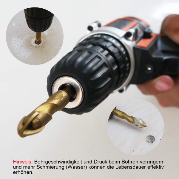 Robuster und langlebiger Glasbohrer: Hergestellt aus hartlegiertem Titan-Plattierungsprozess, der alle Bohrer sehr gute Abriebfestigkeit und extreme Härte macht, wodurch die Gefahr von Brüchen während des Gebrauchs reduziert wird.