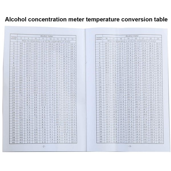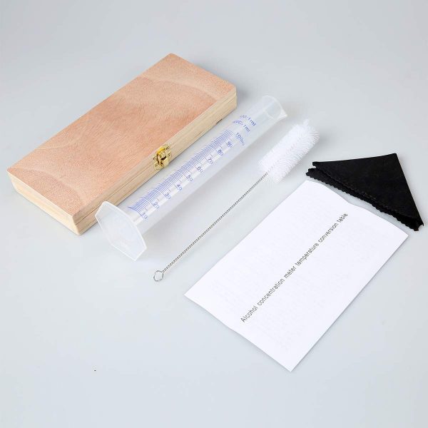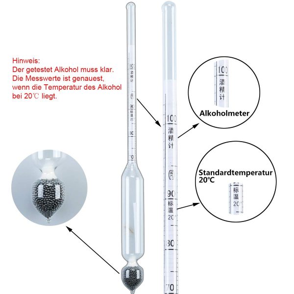 Gemessen Alkohol Bereich: 0-40 Vol%,40–70 Vol%, 70–100 Vol%, die minimale Skala: 1 Vol%, bei der Alkohol-Temperatur von 20 ℃. Im Liefer gibt es auch einen 0-50°C Thermometer、100ml Messzylinder、Reinigungstücher、Reinigungsbürste